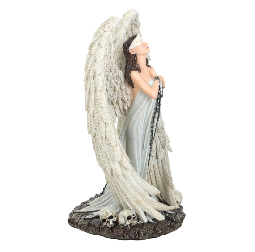 This exquisite resin ornament features a serene angel with a blindfold over her eyes and chains locked onto her arms. She is adorned in a flowing dress and has large angel wings wrapped around her chains. The base of the statue is a striking collection of skulls, adding a gothic touch to the piece. This licensed product from Spiral Direct Ltd will add a touch of mystical charm to any space.
