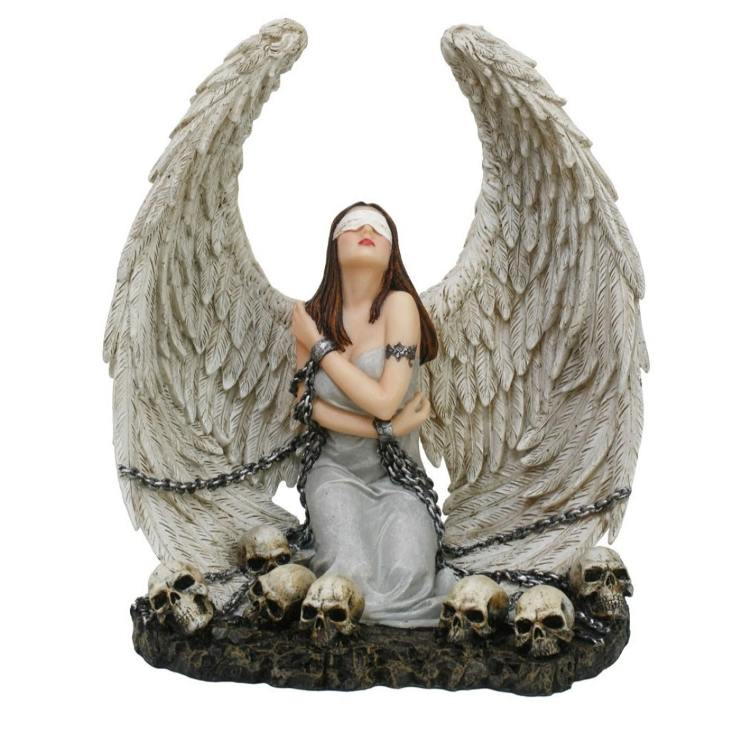 This exquisite resin ornament features a serene angel with a blindfold over her eyes and chains locked onto her arms. Crafted from high quality resin, she is adorned in a flowing dress and has large angel wings rising above her chains. The base of the statue is a striking collection of skulls, adding a gothic touch to the piece. This licensed product from Spiral Direct Ltd will add a touch of mystical charm to any space.